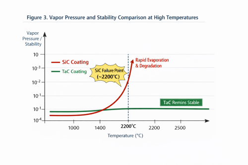 Bənzərsiz Termodinamik Sabitlik: Tantal Karbid (TaC) 3880°C heyrətamiz ərimə nöqtəsinə malikdir. “Journal of Crystal Growth” jurnalında aparılan araşdırmaya görə, SiC örtükləri 2200°C-dən yuxarı “uyğun olmayan buxarlanmaya” məruz qalır – burada silikon karbondan daha sürətli sublimasiya edir, struktur deqradasiyasına və hissəciklərin çirklənməsinə səbəb olur. Bunun əksinə olaraq, TaC-nin buxar təzyiqi 3 ilə 4 arasındadırkristal böyüməsi üçün təmiz bir termal sahəni qoruyaraq, SiC-dən daha aşağı miqyaslı sifarişlər.
